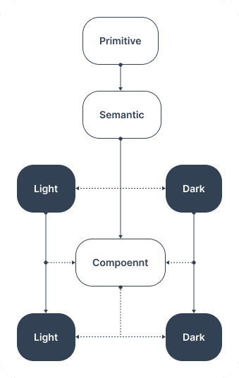 This visual outlines the hierarchy from primitive tokens (like raw values) to semantic and component-specific tokens across light and dark modes. This structure enabled scalable theming, consistent UI application, and seamless developer integration across all platforms.